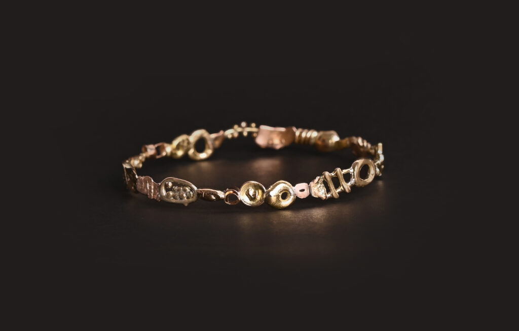El objetivo de la clienta era reciclar dos pulseras en oro que tenía en desuso y convertirlas en una pulsera única y exclusiva que la represente. La clienta quería una pulsera que le recordara a un momento personal que estaba atravesando. El objetivo era que la pulsera tuviese muchos detalles pequeños y únicos que le recordaran esta serie de sucesos felices que estaba viviendo.