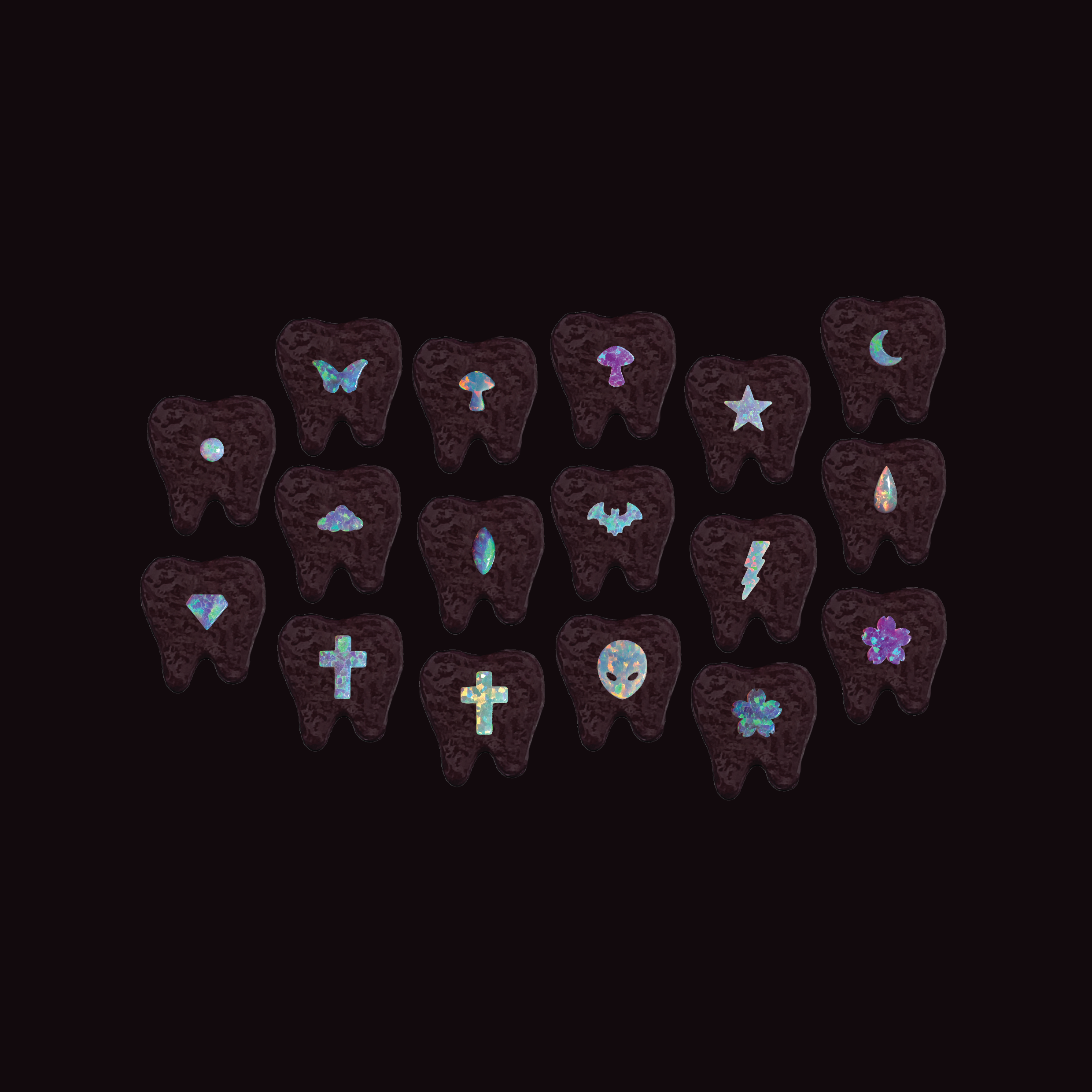 Diseño | Ópalo: Alien, Ópalo: Cruz anaranjada, Ópalo: Cruz azul, Ópalo: Diamante, Ópalo: Estrella, Ópalo: Flor azul, Ópalo: Flor rosa, Ópalo: Gota, Ópalo: Luna, Ópalo: Mariposa, Ópalo: Murciélago, Ópalo: Navette (Agotado), Ópalo: Nube, Ópalo: Punto, Ópalo: Rayo, Ópalo: Seta azul, Ópalo: Seta rosa |