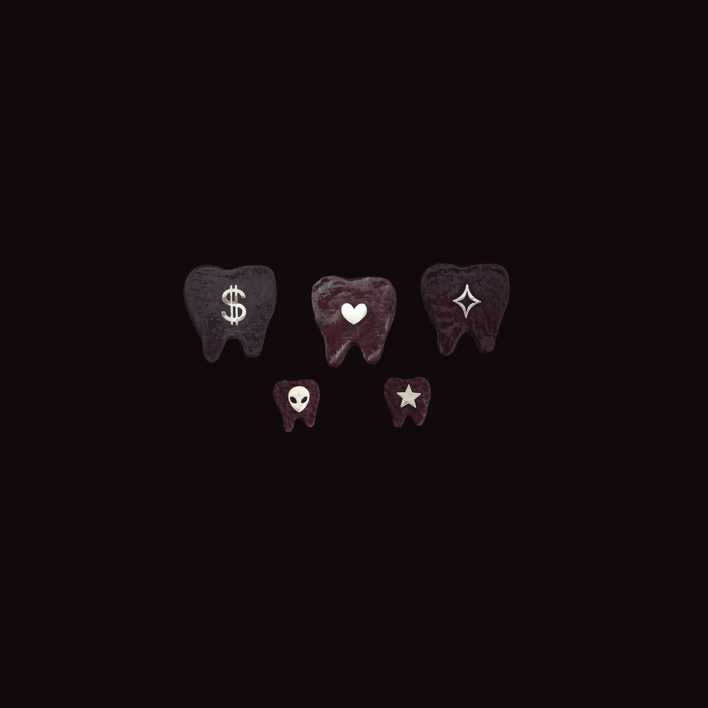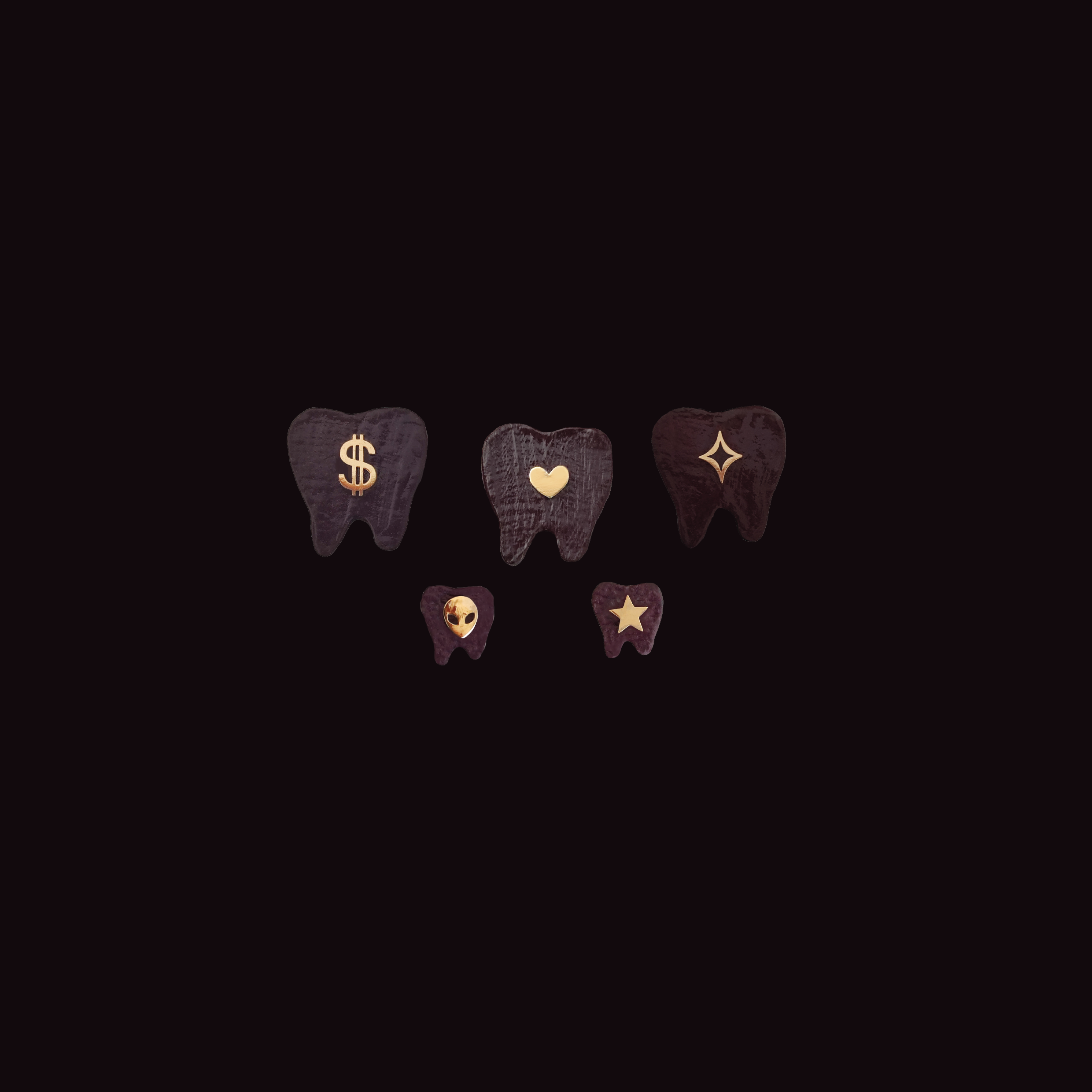 - Oro 18k: Incluye 1 Signo Dólar en Oro 18k, 1 Corazón Macizo en Oro 18k, 1 Destello Contorno en Oro 18k, 1 Alien Mini en Oro 18k y 1 Estrella en Oro 18k.